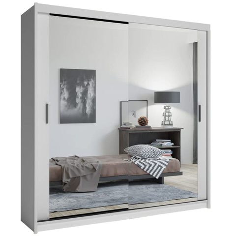 Armario moderno de dos puertas correderas, 2 carriles colgantes con espejo y estantes de almacenamiento para dormitorio