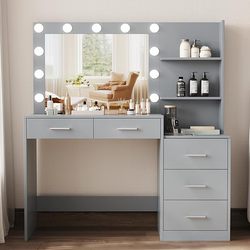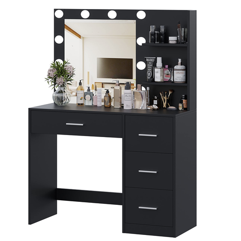 照明付きミラー付きメイクアップバニティテーブル、収納棚と4つの引き出し付きメイクアップバニティデスク